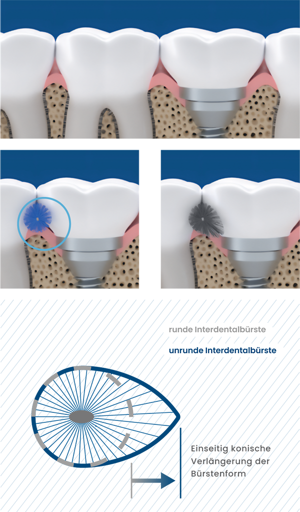 Runde Interdentalbürsten können die Bakterien durch die neue Zahnzwischenraumform nicht bis zum Implantathals beseitigen. Es besteht die Gefahr, dass krankheitserregende Bakterien trotz sorgfältiger Zwischenraumpflege eine Entzündung rund um das Implantat verursachen. Bei anhaltender Entzündung beginnen die Bakterien den Knochen abzubauen. Diese Krankheit nennt man Periimplantitis. Im schlimmsten Fall geht das Implantat mit der Zeit verloren.